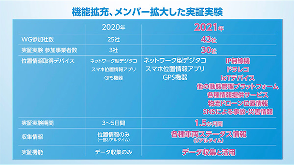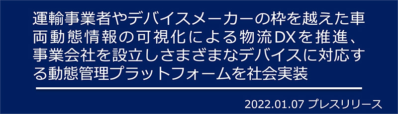 その第1弾として、協議会会員によるワーキンググループの3年越しの研究と30社以上の運送事業者の実証実験を経て、「車両動態管理プラットフォーム」を開発しました。プラットフォームを使うことで車載デバイスのメーカー、機種にかかわらず、サプライチェーンに属する車両の位置や各種ステータスを一元的に集約、見える化することが可能です。この情報を物流関係者(発荷主・物流事業者・物流パートナー事業者(庸車)・着荷主など)が把握、共有することで、サプライチェーン全体の物流効率を改善することを目指しています。